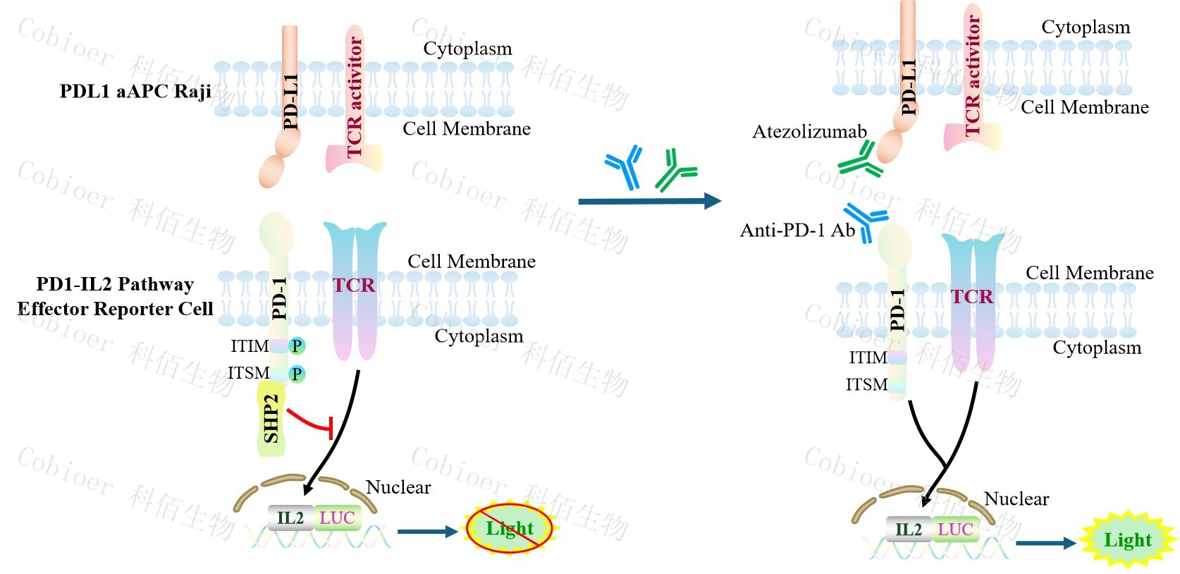 PDL1 aAPC Raji 作為 PD1-IL2 Pathway Effector Reporter Cell 的靶細胞,藥靶模型很好 的模擬了體內 PD1&PDL1 的信號轉導過程,原理見下圖所示。![]() Figure 1. PDL1 aAPC Raji 模型原理圖