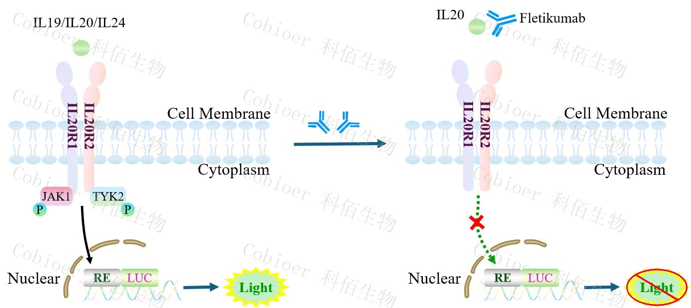 hIL19/IL20/IL24 Triple Effector Reporter Cell 報告基因藥靶模型很好的模擬了體內(nèi)IL19/IL20/IL24 的信號轉(zhuǎn)導過程,原理見下圖所示。