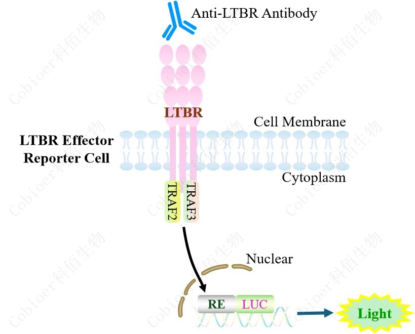 LTBR Effector Reporter Cell 報(bào)告基因藥靶模型很好的模擬了體內(nèi) LTBR 的信號(hào)轉(zhuǎn)導(dǎo)過 程, 原理見下圖所示。