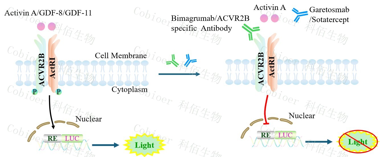 ACVR2B Effector Reporter Cell 報(bào)告基因藥靶模型很好的模擬了體內(nèi) ACVR2A 的信號(hào)轉(zhuǎn)導(dǎo)過(guò)程,原理見(jiàn)圖 所示。