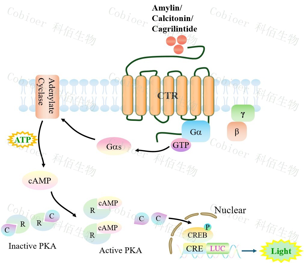 CTR CRE-Luc CHO 報(bào)告基因藥靶模型很好的模擬了體內(nèi) CTR 的信號(hào)轉(zhuǎn)導(dǎo)過(guò)程,原理見(jiàn)下圖所示。![]() Figure 1. CTR CRE-Luc CHO 細(xì)胞模型原理圖 |