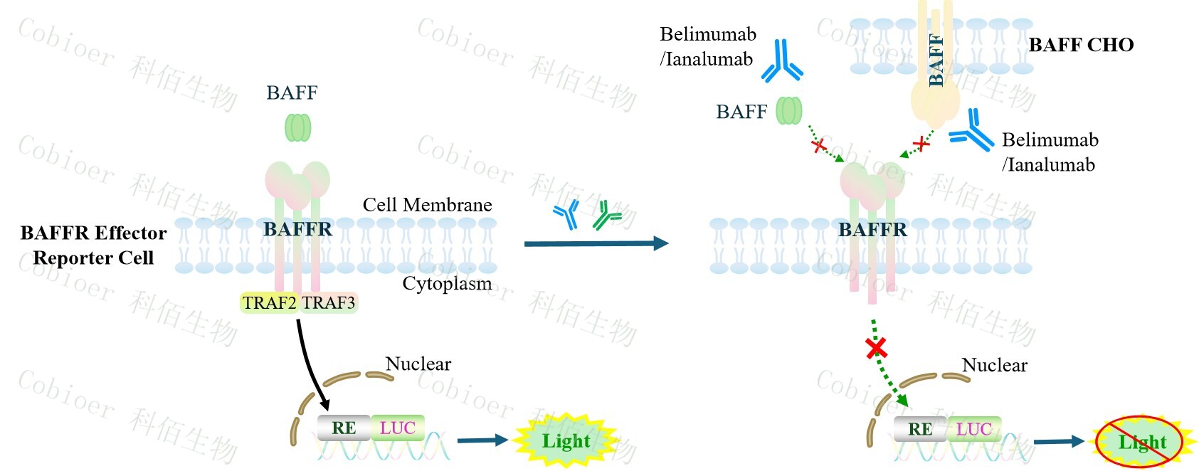 BAFFR Effector Reporter Cell 報告基因藥靶模型很好的模擬了體內 BAFF 的信號轉導過程,原理見下圖所示。![]() Figure 1. BAFFR Effector Reporter Cell 細胞模型原理圖 |