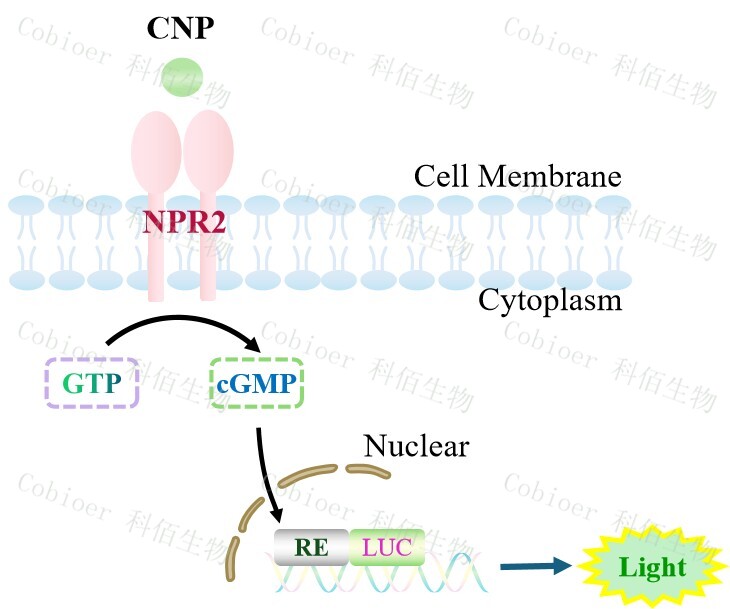 NPR2 Effector Reporter Cell 報(bào)告基因藥靶模型很好的模擬了體內(nèi) NPR2 的信號(hào)轉(zhuǎn)導(dǎo)過程,原理見下圖所示。![]() Figure 1. NPR2 Effector Reporter Cell 細(xì)胞模型原理圖