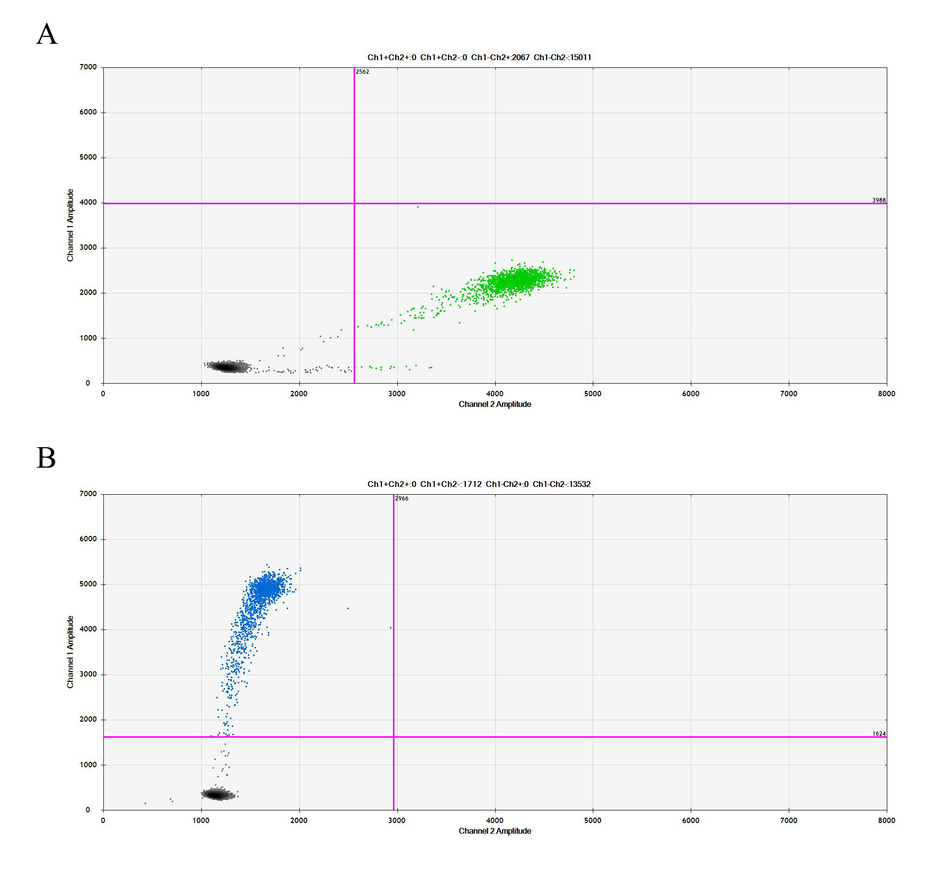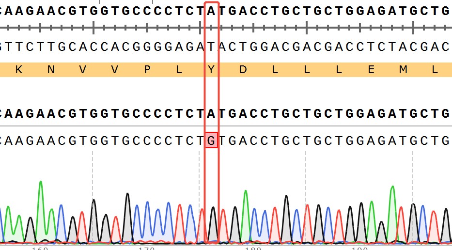 ![]() Figure 2. Sanger of ESR1[Y537C](Homozygous,AF%:100) Isogenic MCF7. ![]() Figure 3. A: MCF7 Parental Cell;B:ESR1[Y537C](Homozygous,AF%:100) Isogenic MCF7 通道2 藍色微滴代表ESR1[Y537C]突變陽性,通道2 綠色微滴代表該位點為陰性野生型 ![]() Figure 4. CTG Proliferation Assay of ESR1[Y537C](Homozygous,AF%:100) lsogenic MCF7(2C40). |