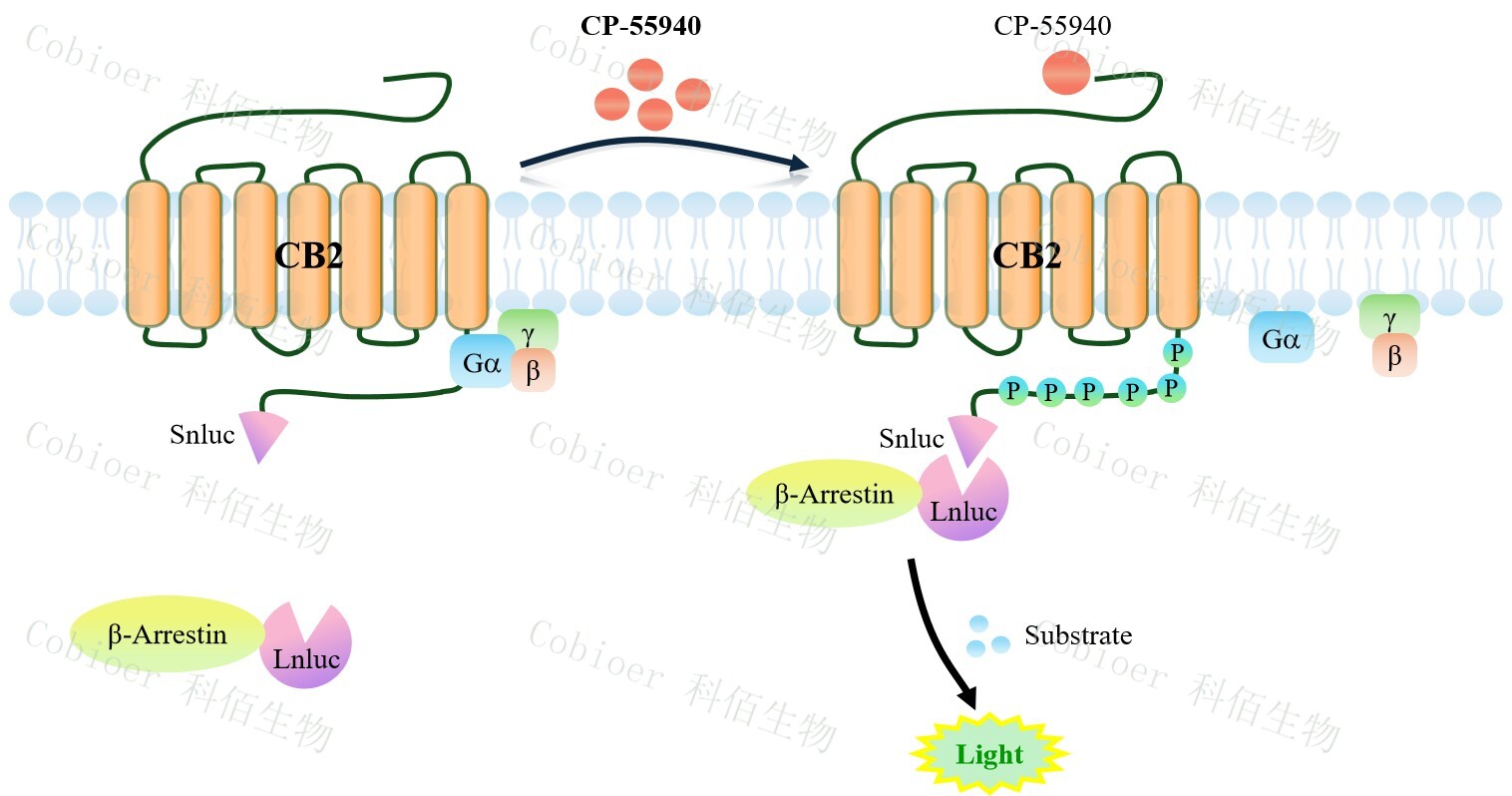 CB2 β-Arrestin CHO 報告基因藥靶模型很好的模擬了體內(nèi) CB2/β-Arrestin 的信號轉(zhuǎn)導(dǎo)過程,原理見下圖所示。當(dāng)缺乏配體刺激時,β-Arrestin 不與 CB2 結(jié)合,融合β-Arrestin 的熒 光素酶處于失活構(gòu)象,當(dāng) CB2 遭遇配體刺激時,融合熒光素酶報告基因的β-Arrestin 被招 募,使熒光素酶報告基因處于激活狀態(tài),加入其底物后發(fā)光信號增強(qiáng)。![]() Figure 1. CB2 β-Arrestin CHO 細(xì)胞模型原理圖 |