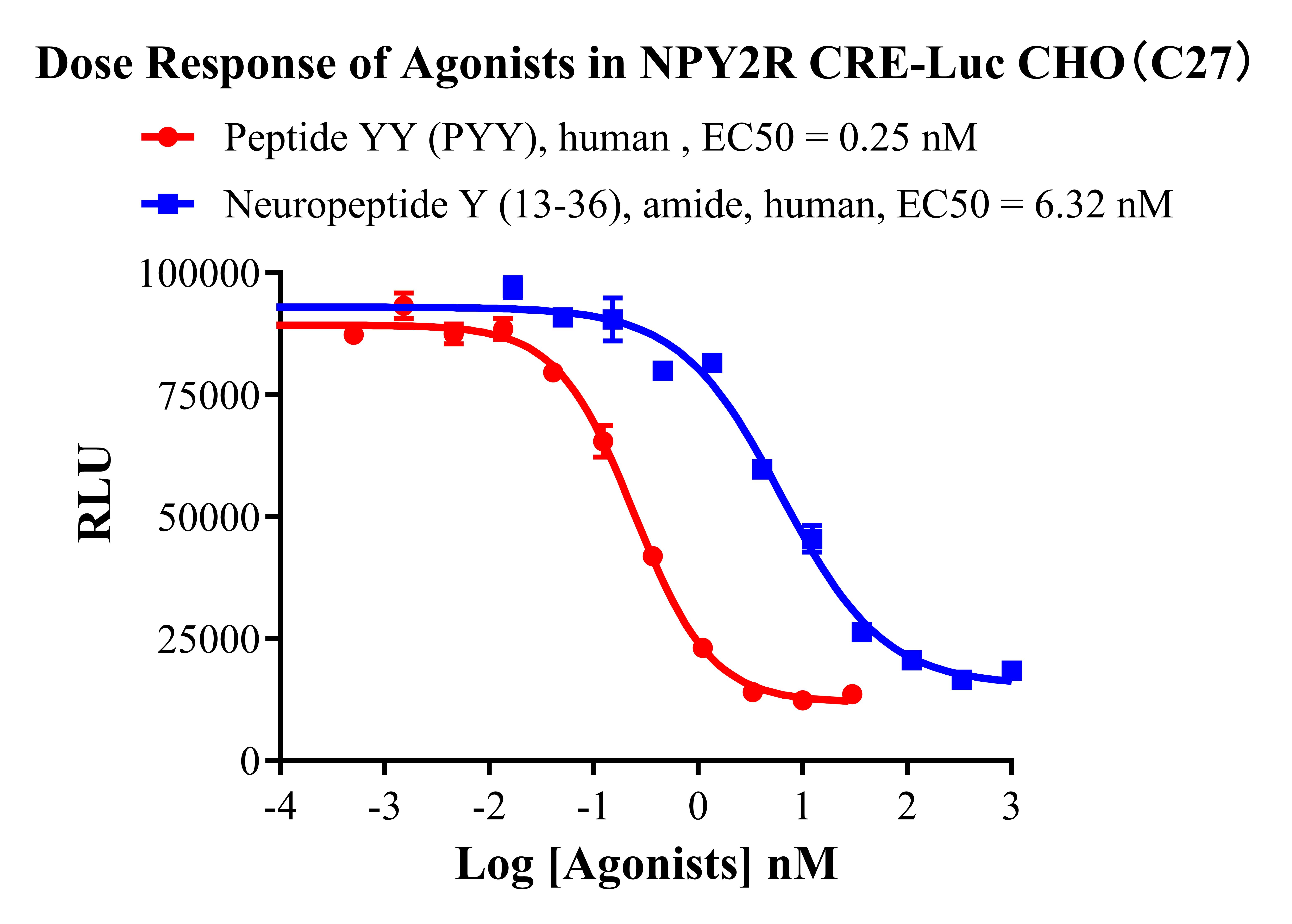 V. Representative Data![]() Recombinant NPY2R CRE-Luc CHO stably expressing NPY2R. ![]() Figure 2. Dose Response of Agonists in NPY2R CRE-Luc CHO(C27). Figure 1. |