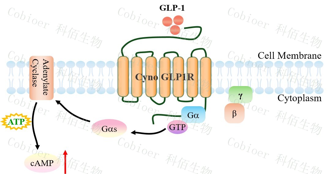 GLP1R 藥靶模型很好的模擬了體內(nèi) GLP1R 的信號轉(zhuǎn)導(dǎo)過程,原理見下圖所示。 ![]() Figure 1. Cyno GLP1R CHO 細胞模型原理圖