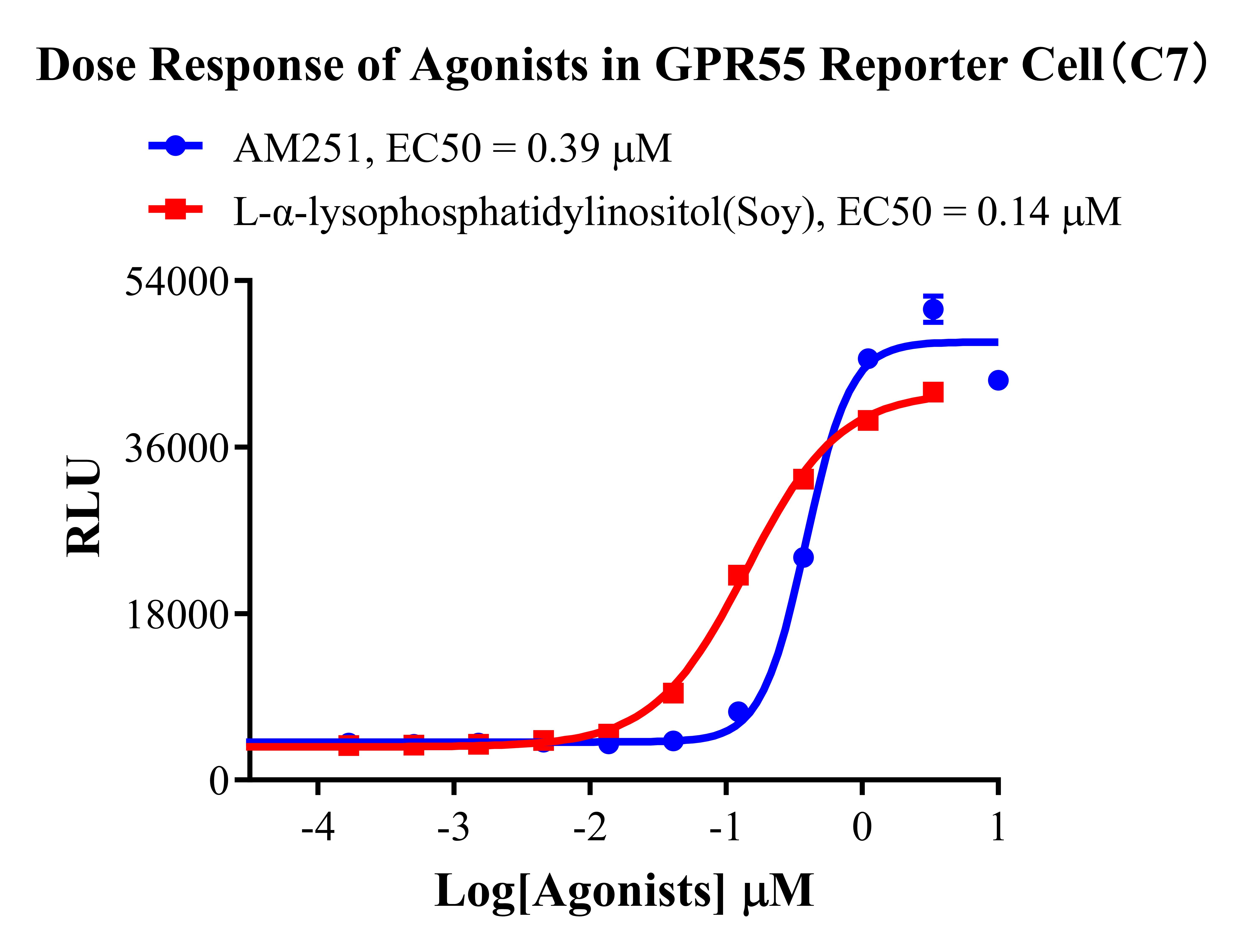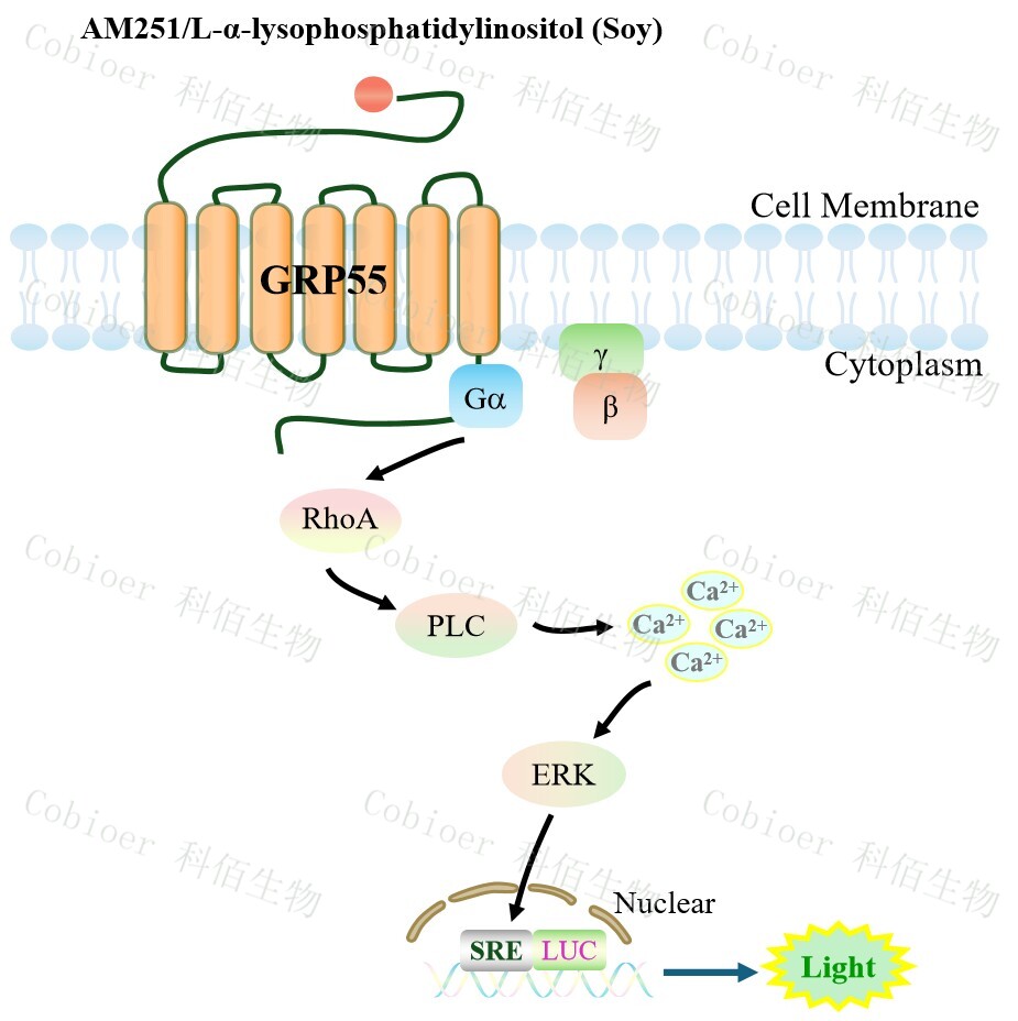 GPR55 Reporter Cell 藥靶模型很好的模擬了體內 GPR55 的信號轉導過程,原理見下圖所示。 ![]() Figure 1. GPR55 Reporter Cell 細胞模型原理圖 |