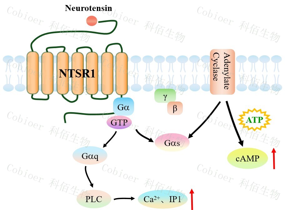 cAMP 在 G 蛋白偶聯(lián)受體(GPCR)信號轉導中是一種關鍵的第二信使。當配體結合 到 GPCR,構象發(fā)生變化,激活受體接著激活 G 蛋白,Gs 的激活導致腺苷酸環(huán)化酶調(diào)控 cAMP 的升高。 NTSR1 還可以通過 Gq 蛋白的信號通路,調(diào)控 IP1 的升高。NTSR1 與配體結合,導致 Gαq 亞基的激活,觸發(fā) PLC-γ,從而產(chǎn)生兩個第二信使:IP3 和 DAG,它們參與細胞內(nèi)鈣 動員。由于 IP3 在代謝上不穩(wěn)定,因此測量通路激活的替代標志物 IP1 作為檢測標準。 NTSR1 CHO 細胞藥靶模型很好的模擬了體內(nèi) NTSR1 的信號轉導過程,原理見下圖所示。 ![]() Figure 1. NTSR1 CHO 細胞模型原理圖 |