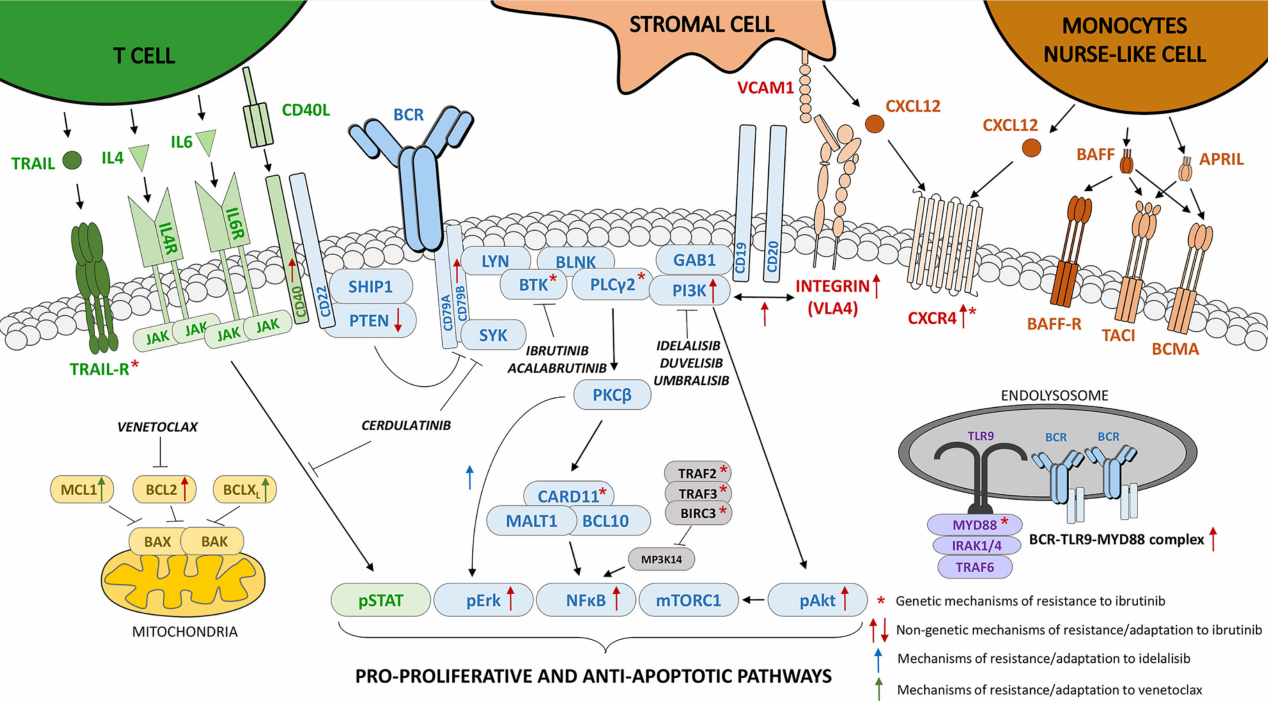 B細胞受體(BCR)信號通路在成熟B細胞惡性腫瘤的發(fā)生和進展中起著核心作用,例如慢性淋巴細胞白血病(CLL)、套細胞淋巴瘤(MCL)、彌漫性大B細胞淋巴瘤(DLBCL)、濾泡性淋巴瘤(FL)或華氏巨球蛋白血癥(WM)。BCR信號通路中的激活突變常見于DLBCL、FL或WM;而在CLL和MCL中一般會缺失,但BCR信號轉(zhuǎn)導(dǎo)被組成性激活,并且是其發(fā)病機制的關(guān)鍵參與者。