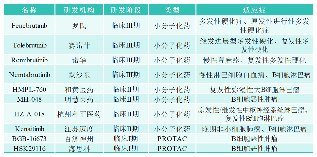 2013年,第一代BTK抑制劑Ibrutinib(伊布替尼)已被批準用于治療 CLL、MCL、WM 和邊緣區(qū)淋巴瘤 (MZL),它與BTK活性位點的半胱氨酸殘基形成共價鍵,封閉了ATP結(jié)合口袋,從而阻斷BTK的酶活性。雖然它是一種強效藥物,但它存在脫靶效應(yīng),并且相當(dāng)多的患者對治療產(chǎn)生耐藥性或毒性而停止治療。第二代的BTK抑制劑(如Acalabrutinib等)在保持高選擇性的同時,減少了脫靶效應(yīng),提高了安全性和療效。但第一代和第二代的抑制劑都屬于不可逆抑制劑。BTK共價抑制劑治療后常會產(chǎn)生耐藥,部分耐藥機制為BTK 基因產(chǎn)生耐藥突變導(dǎo)致,其中最常見的耐藥突變?yōu)镃481位的氨基酸突變?yōu)镾。Pirtobrutinib是由禮來研發(fā)的首款獲批上市的非共價的第三代BTK抑制劑,它通過非共價、非C481依賴的結(jié)合阻斷BTK的ATP結(jié)合位點,從而克服由C481S導(dǎo)致的共價BTK抑制劑耐藥機制,另外包括fenebrutinib,Nemtabrutinib等也屬于同一類型的三代非共價抑制劑。除了上述共價或非共價BTK抑制劑外,為了進一步提高藥效和克服耐藥,近年來一些藥企也在開發(fā)針對BTK靶點的PROTAC藥物,下表為部分在研的BTK抑制劑以及PROTAC藥物。