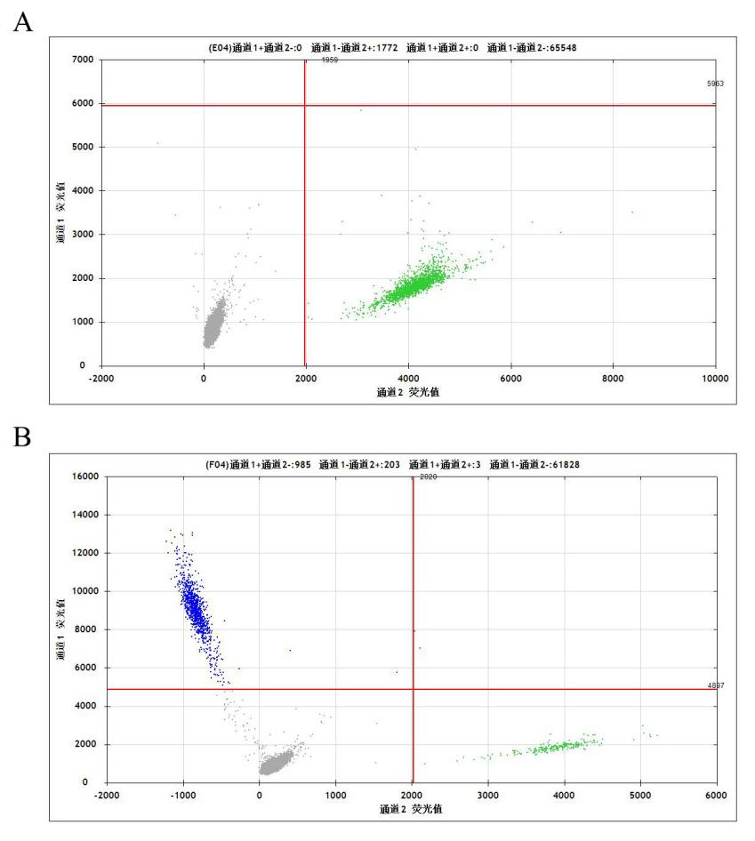 Figure 4:Gene Edited BTK[C481S] Isogenic Cell-ddPCR結(jié)果(通道1 藍色微滴代表BTK C481S 突變陽性,通道2 綠色微滴代表該位點為陰性野生型)