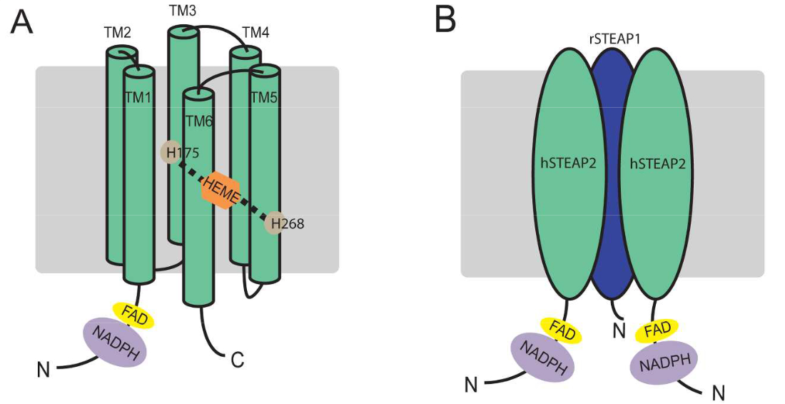 STEAP1、STEAP2均 屬于 STEAP (six-transmembrane epithelial antigen of prostate) 蛋白家族,具有六個跨膜結(jié)構(gòu)域、細胞質(zhì)N端的多跨膜蛋白。其中STEAP1的編碼基因由 339 個氨基酸組成,位于 7q21.13 染色體上。STEAP1的 N 端胞質(zhì)結(jié)構(gòu)域與 STEAP 蛋白家族的其他成員不同,不具有類似于 NADP+氧化還原酶(FNO)結(jié)構(gòu)域的特征。因此,STEAP1不能獨立表現(xiàn)出Fe3+和 Cu2+的還原活性。