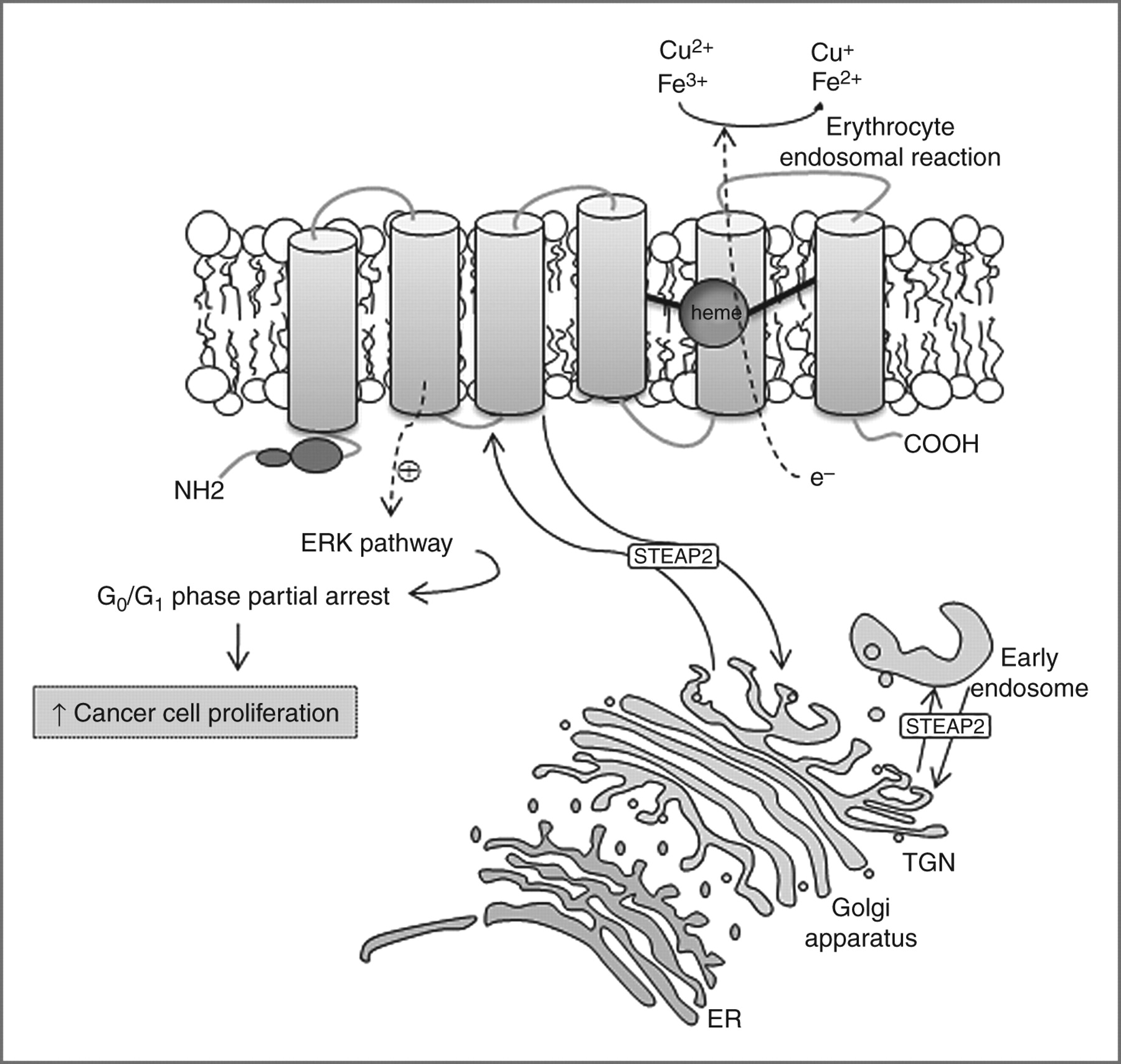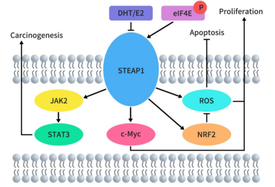 STEAP2,又被稱為前列腺六跨膜蛋白 1(STAMP1),是一種由 490 個氨基酸組成的(56.1 kDa)蛋白質(zhì),其在高爾基體復(fù)合體、跨高爾基體網(wǎng)絡(luò)以及質(zhì)膜中高度表達。這表明 STEAP2 參與了某些內(nèi)吞和外排運輸途徑。STEAP2 有助于紅細胞中 Fe3+ 和 Cu2+ 的正常攝取,并將其還原為 Fe2+ 和 Cu+,從而促進轉(zhuǎn)鐵蛋白循環(huán)的進行。通過激活 ERK 通路,STEAP2 誘導(dǎo)癌細胞在 G0-G1 細胞周期階段的部分停滯,從而增加細胞增殖和腫瘤發(fā)展。