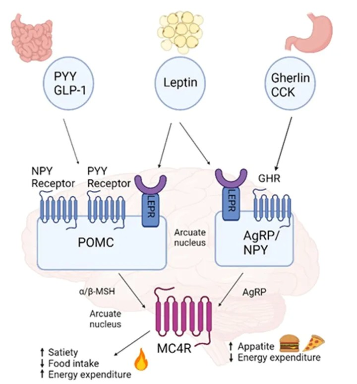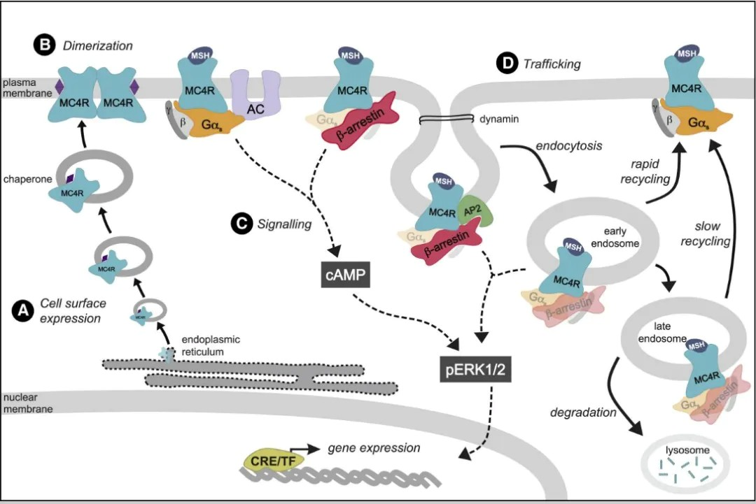 MC4R (黑皮質(zhì)素4受體) 是黑皮質(zhì)素受體家族成員之一,其家族屬于視紫紅質(zhì)樣A類(lèi)GPCR,成員還包括:MC1R、MC2R、MC3R和MC5R。黑皮質(zhì)素受體 (MC1R-MC5R) 位于多種細(xì)胞類(lèi)型上,并遍布大多數(shù)身體系統(tǒng)。MC4R是中樞黑皮質(zhì)素系統(tǒng)的重要組成部分,主要在下丘腦室旁核(PVH)中表達(dá),是一種A類(lèi)GPCR。在高能量平衡狀態(tài)下,阿片黑皮質(zhì)素原 (POMC) 神經(jīng)元釋放多肽MC4R激動(dòng)劑-α-黑素細(xì)胞刺激激素(α-MSH)。α- MSH與MC4R結(jié)合會(huì)激活MC4R信號(hào)傳導(dǎo),抑制食欲和食物攝入。在低能量平衡狀態(tài)下,下丘腦室旁核中釋放AgRP (agouti-related peptide)。AgRP作為MC4R與α- MSH結(jié)合的競(jìng)爭(zhēng)性拮抗劑,也是MC4R反向激動(dòng)劑,抑制MC4R信號(hào)傳導(dǎo)。