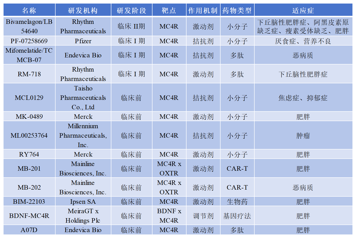 除去臨床階段終止及無(wú)進(jìn)展的幾款藥物,目前共有多款處于臨床及臨床前的靶向MC4R的藥物,既有小分子藥物也有多肽類(lèi)藥物。部分信息如下: